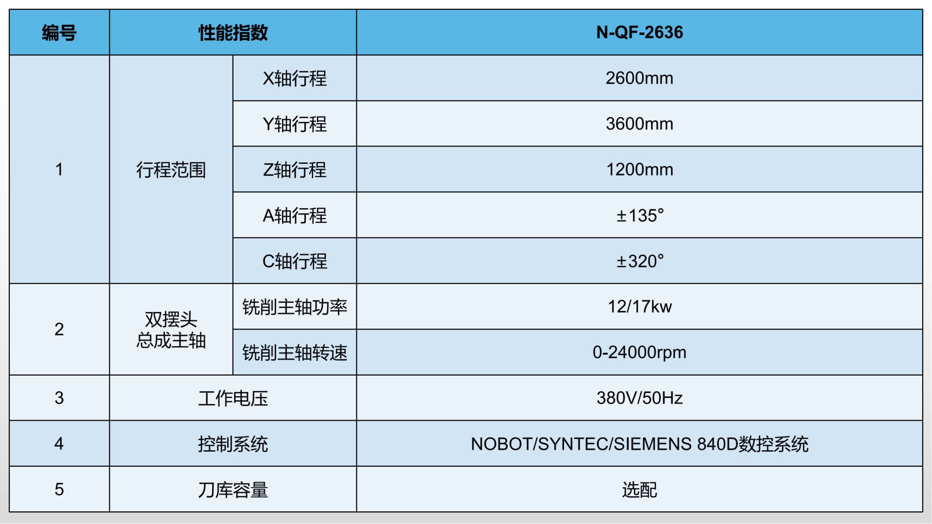 The QF series five-axis machining center adopts an advanced gantry-type mobile structure, possessing the excellent cutting characteristics of a high-speed milling machine. The mobile worktable ensures the machine tool has optimal dynamic motion characteristics and drive rigidity. The worktable moves smoothly in the axial direction. During processing, the five axes drive the tool movement, machining around the workpiece to achieve five-axis linkage three-dimensional movement. The dual worktable allows for uninterrupted production processing, with one worktable being machined while the other is loaded.
